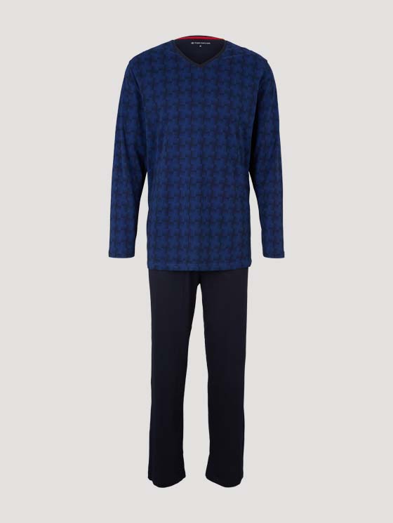 Pijama de hombre de punto compuesto por manga larga con cuello pico color azul estampado y pantalón largo. Modelo 71223. Composición 100% algodón. Fabricante alemán. (Tallas completas)
